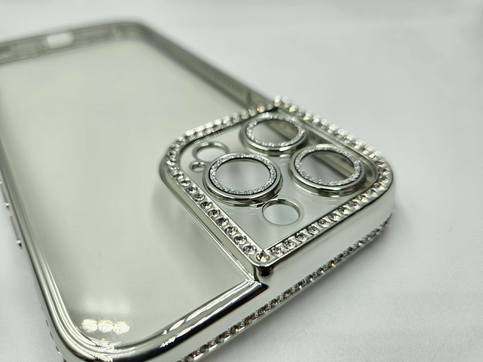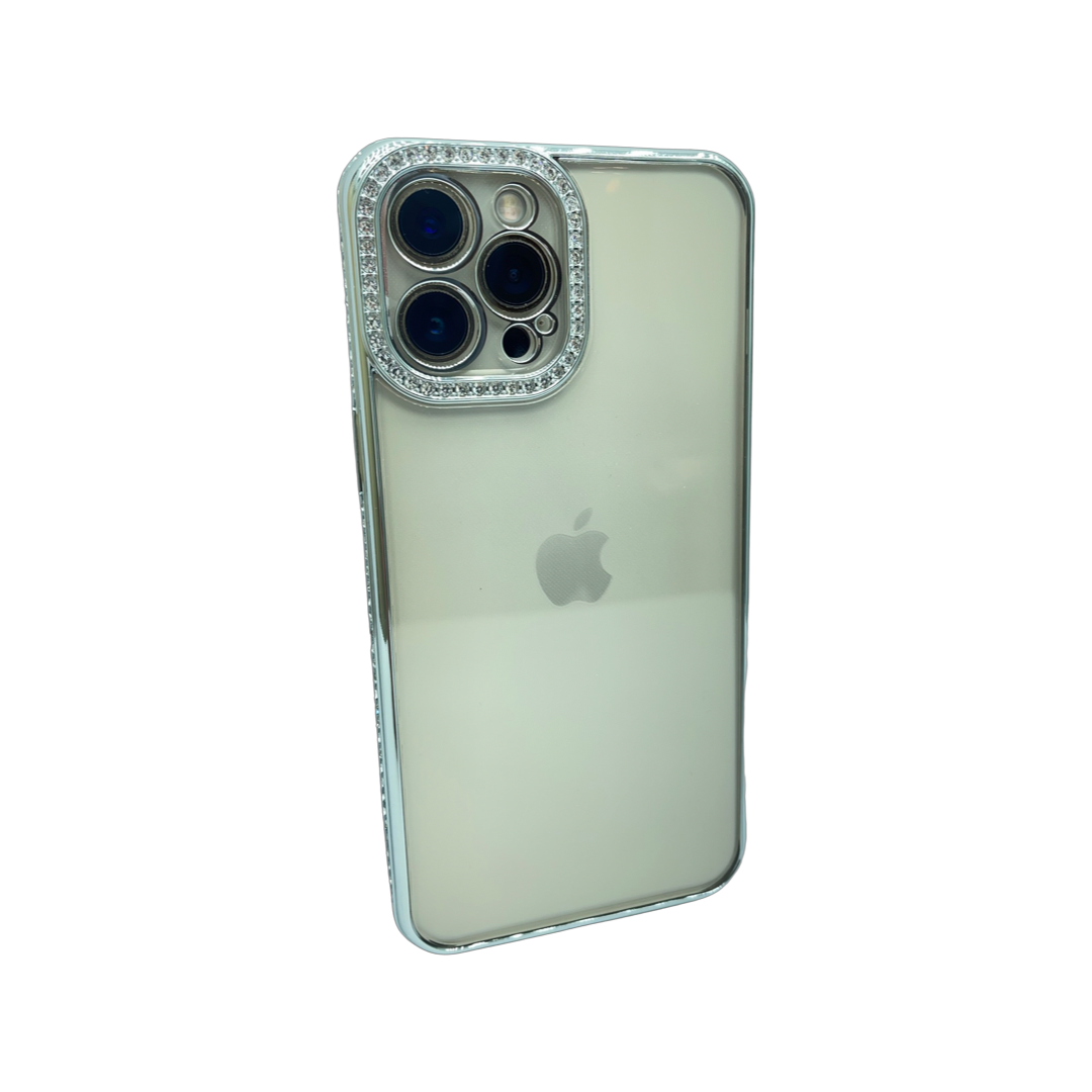 Husa Iphone 14 Pro Max din silicon , transparent cu strasuri pe margine si rama camera Argintiu